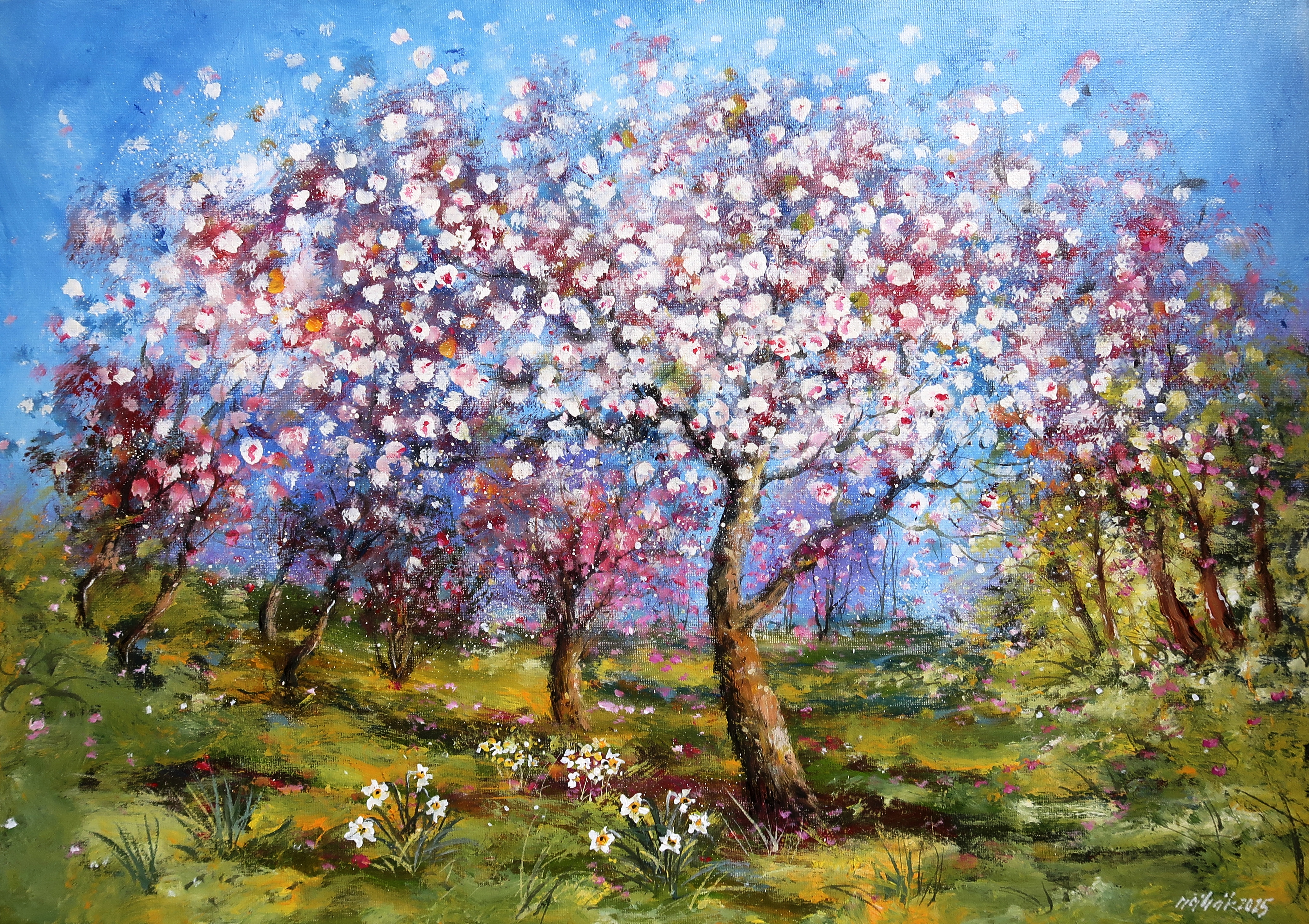 Jaro v sadu - orig. malba akrylem na napnutém plátně/blindrámu - 70x50 cm - volně/bez rámu - namalováno i po stranách plátna - závěrečný lak - možno hned zavěsit...
