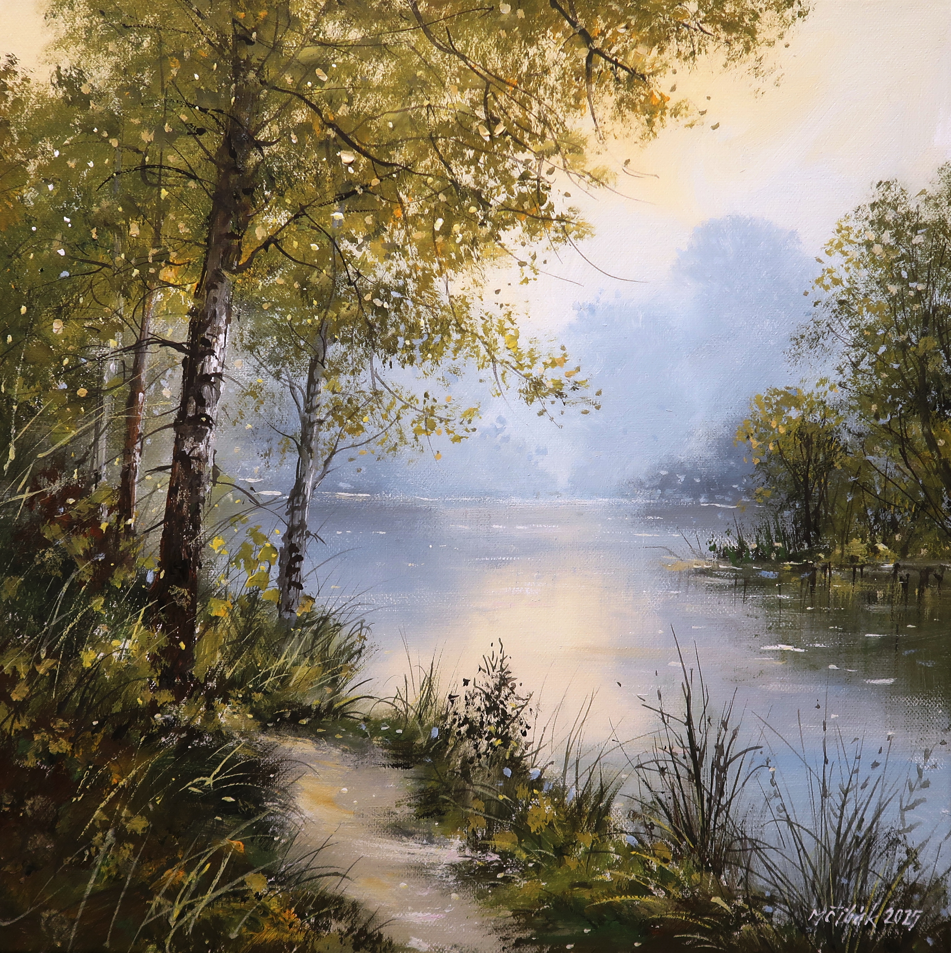 Lesní jezírko - originální malba akrylem na napnutém plátně/blindrámu - závěrečný trvanlivý lak - rozměr 40x40 cm - volně - bez rámu - namalováno i po stranách plátna - možno ihned zavěsit...