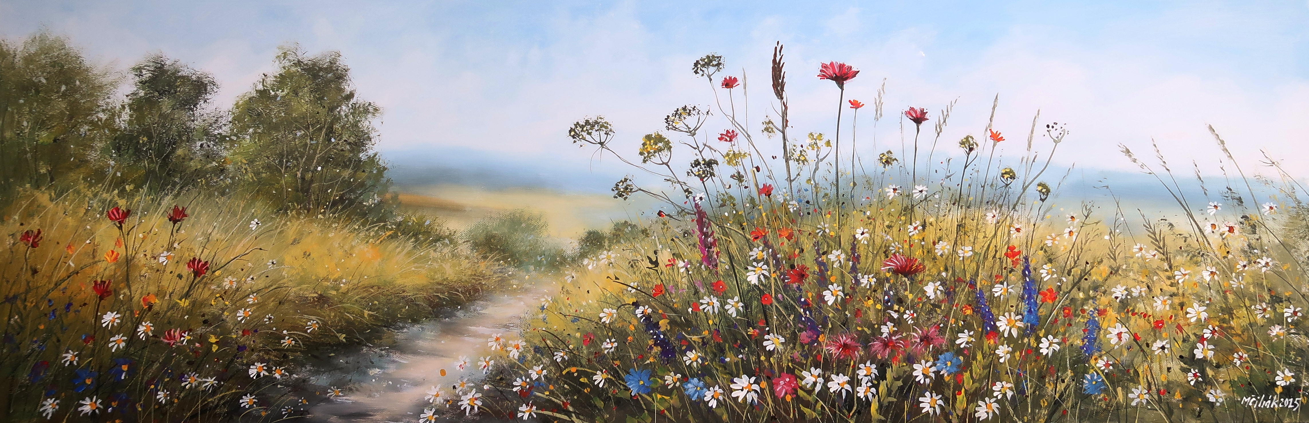 Letní cestou - originální malba akrylem na napnutém plátně/blindrámu - závěrečný trvanlivý lak - efektní rozměr - panorama 120x40 cm - volně - bez rámu - namalováno i po stranách plátna - možno ihned zavěsit...