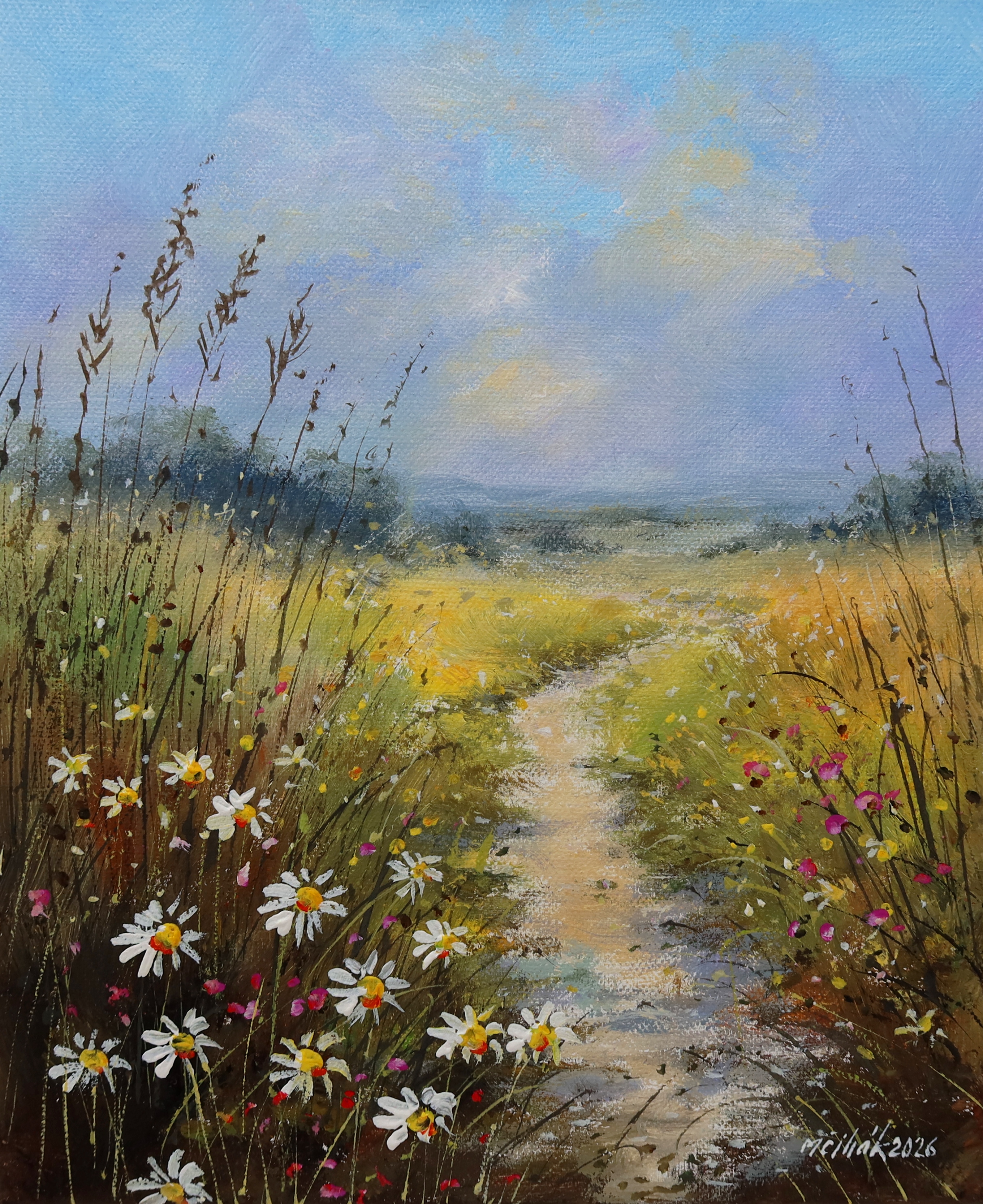 Letní krajinou - originální malba akrylem na napnutém plátně/blindrámu - závěrečný trvanlivý lak - rozměr 30x25 cm - volně - bez rámu - namalováno i po stranách plátna - možno ihned zavěsit... celý popis