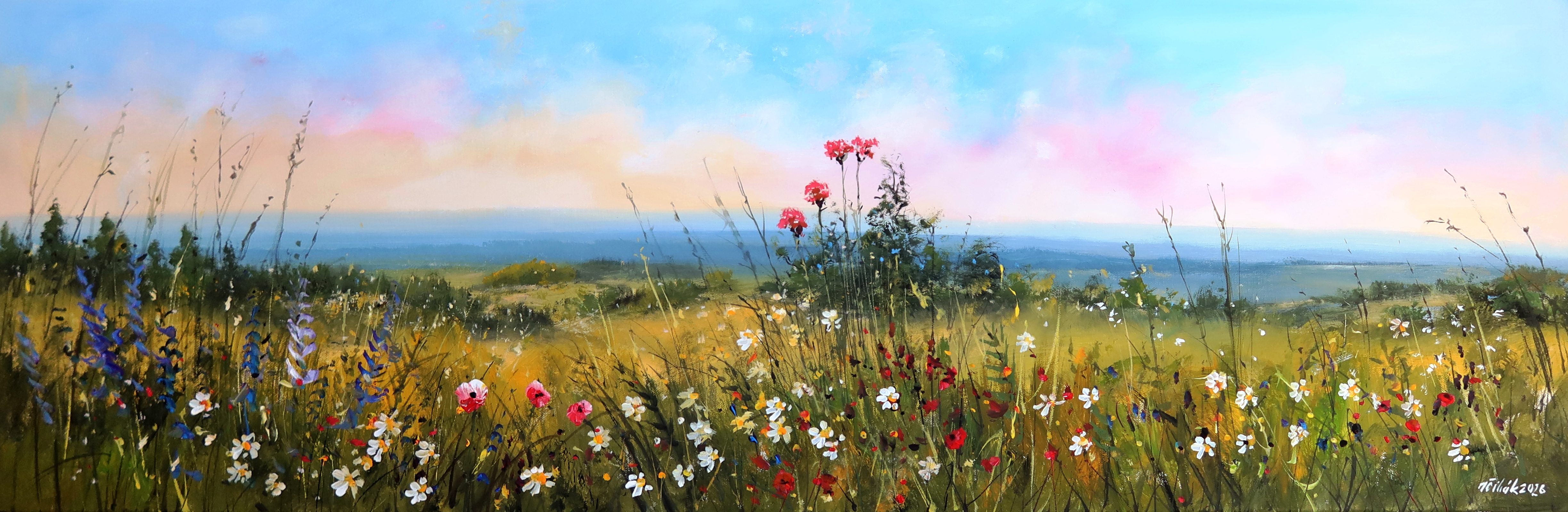 Letní podvečer - originální malba akrylem na napnutém plátně/blindrámu - závěrečný trvanlivý lak - efektní rozměr - panorama 120x40 cm - volně - bez rámu - namalováno i po stranách plátna - možno ihned zavěsit...