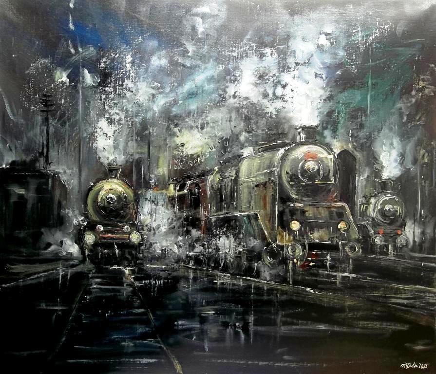 Parní lokomotivy - originální malba akrylem na napnutém plátně/blindrámu - závěrečný trvanlivý lak - rozměr 80x60 cm - volně - bez rámu - namalováno i po stranách plátna - možno ihned zavěsit...