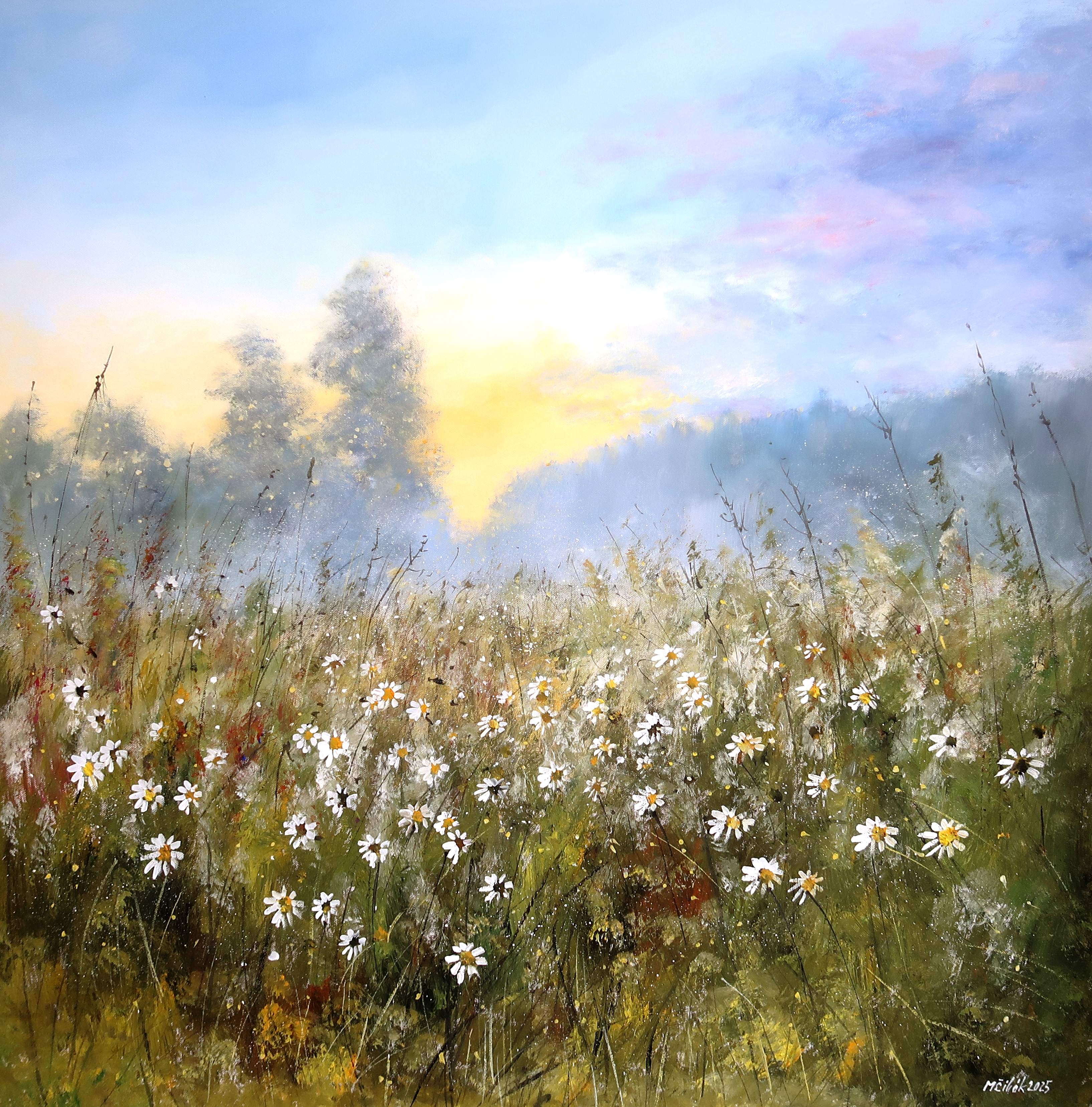 Podvečerní louka - originální malba akrylem na napnutém plátně/blindrámu - závěrečný trvanlivý lak - velký rozměr 100x100 cm - volně - bez rámu - namalováno i po stranách plátna - možno ihned zavěsit...