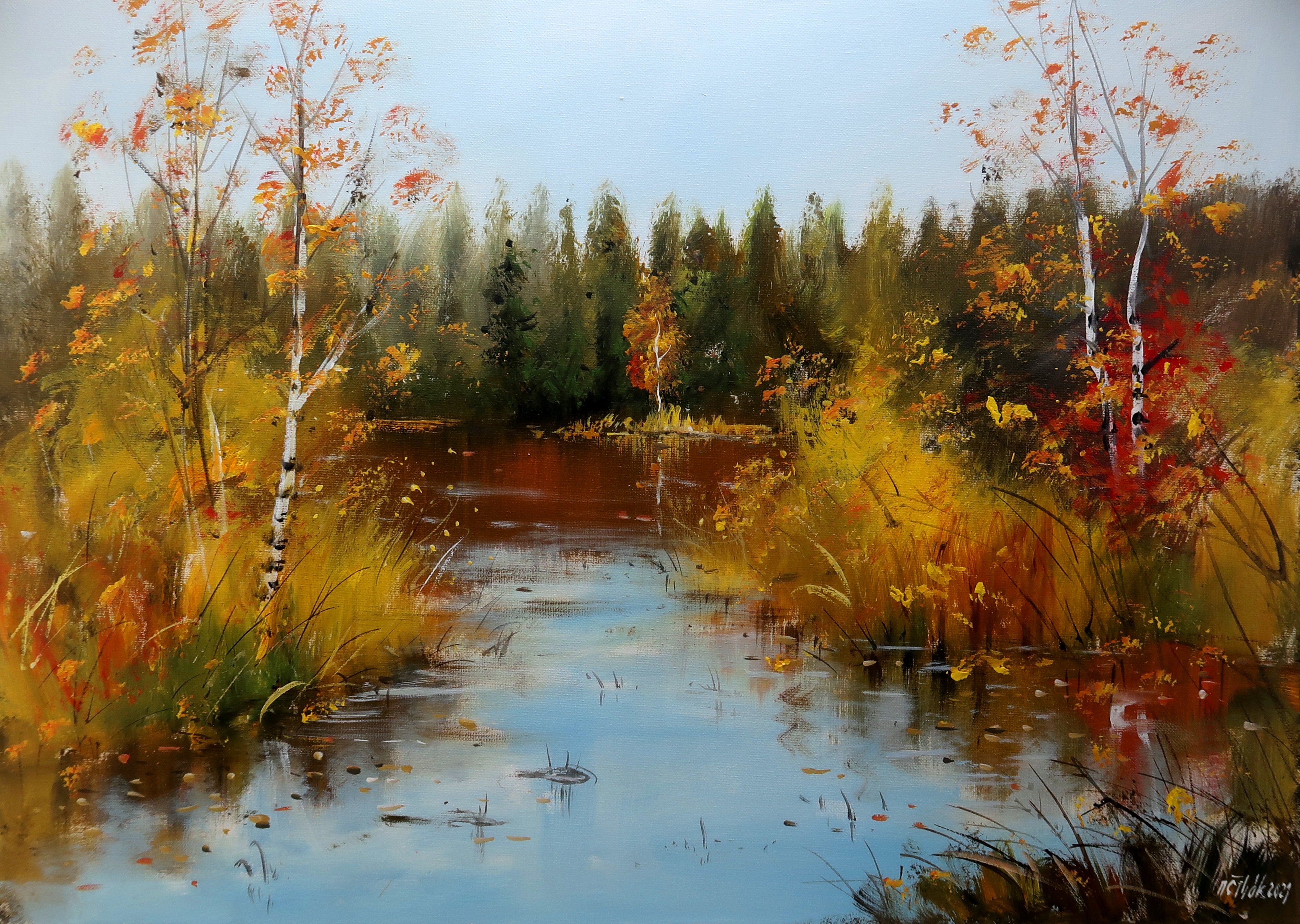 Podzimní rybník - orig. malba akrylem na napnutém plátně/blindrámu - větší rozměr 70x50 cm - volně/bez rámu - namalováno i po stranách plátna - závěrečný lak - možno hned zavěsit...