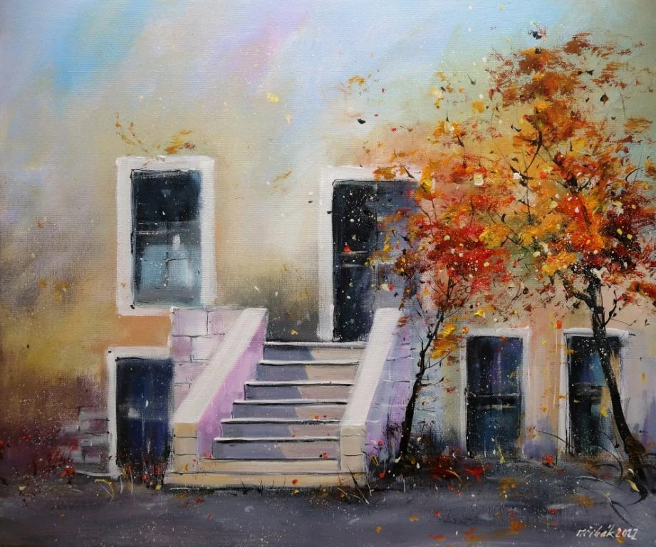 Podzimní schody - orig. malba akrylem na napnutém plátně/blindrámu - 60x50 cm - volně/bez rámu - namalováno i po stranách plátna - závěrečný lak - možno hned zavěsit...