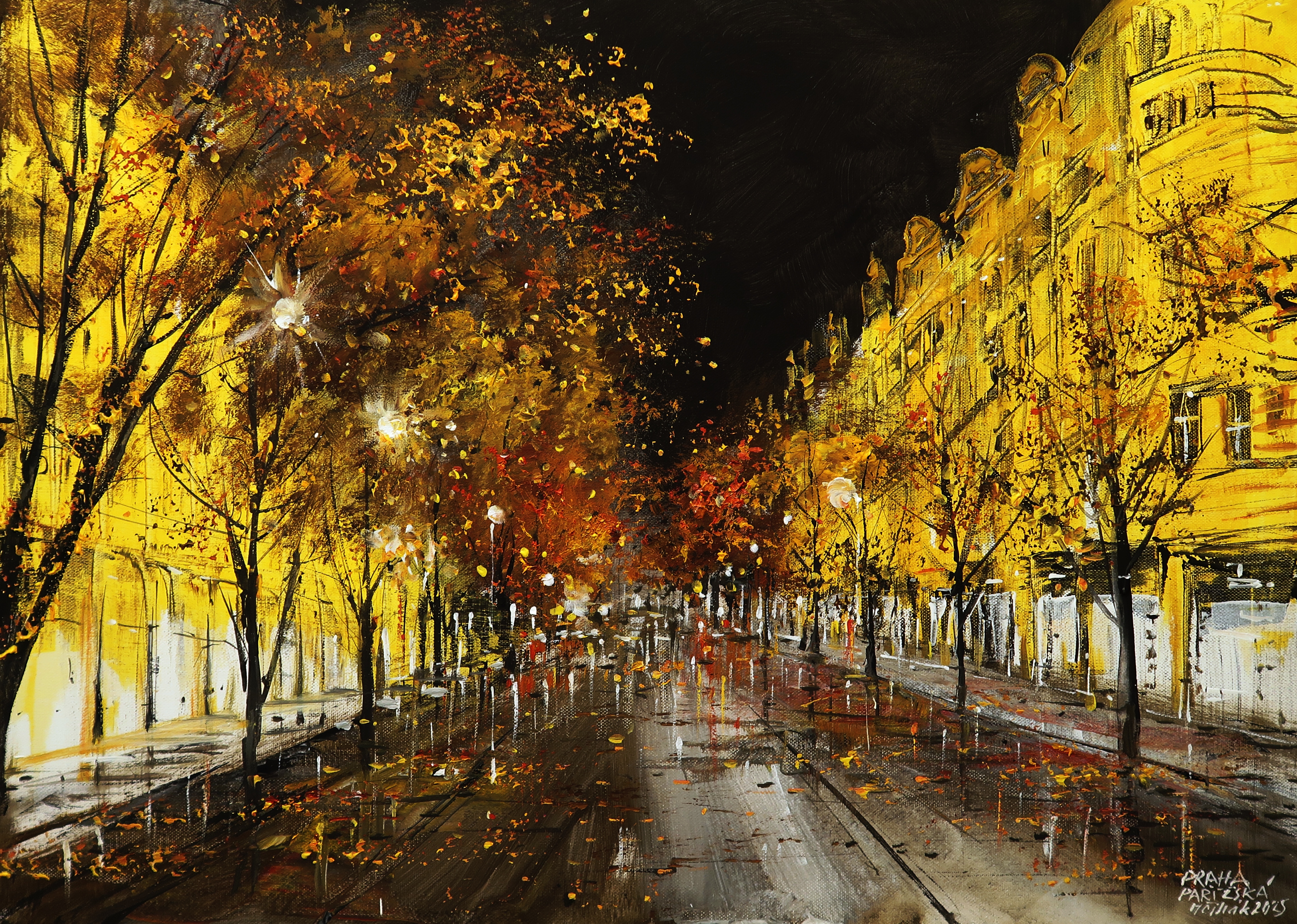 Praha - Pařížská ulice - orig. malba akrylem na napnutém plátně/blindrámu - větší rozměr 70x50 cm - volně/bez rámu - namalováno i po stranách plátna - závěrečný lak - možno hned zavěsit...