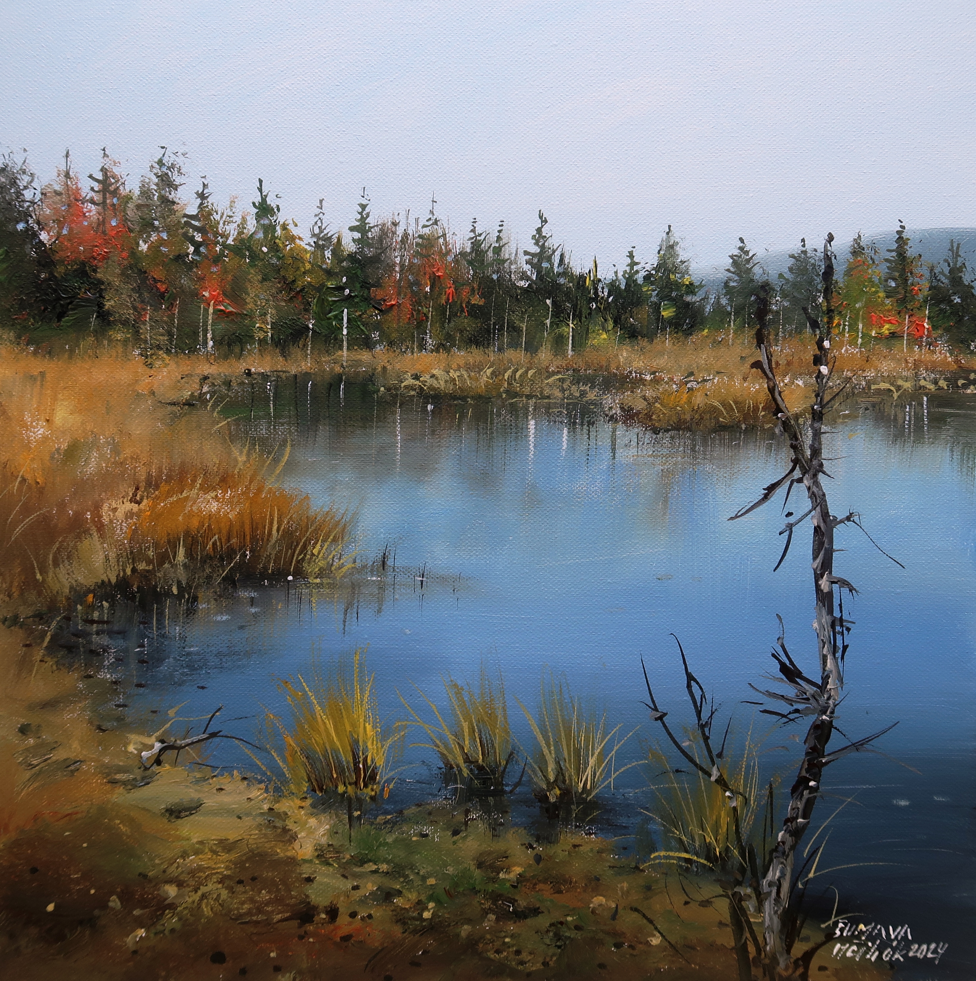Šumava - Chalupská slať - originální malba akrylem na napnutém plátně/blindrámu - závěrečný trvanlivý lak - rozměr 40x40 cm - volně - bez rámu - namalováno i po stranách plátna - možno ihned zavěsit...