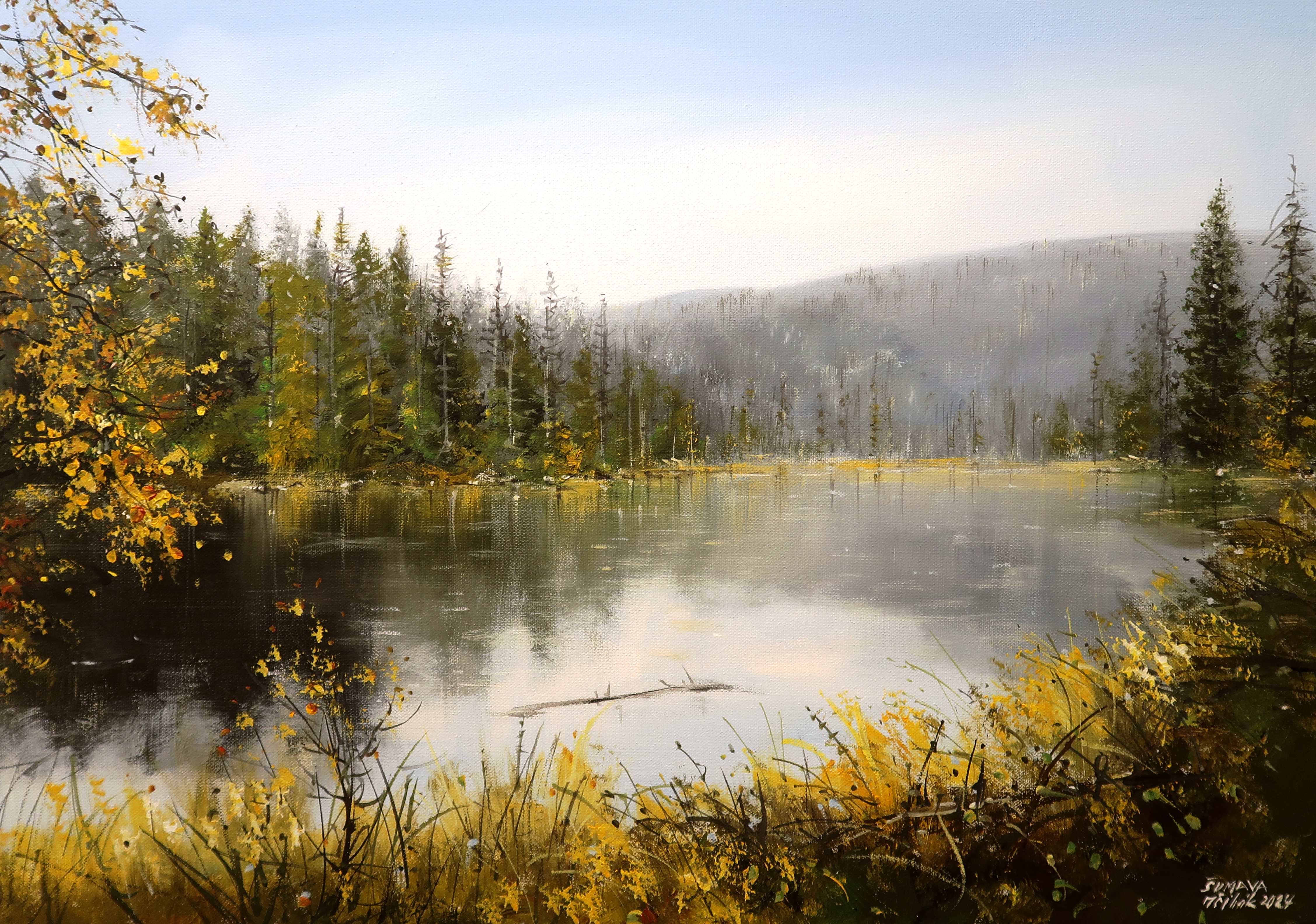 Šumava - Jezero Laka - originální malba akrylem na napnutém plátně/blindrámu - závěrečný trvanlivý lak - větší rozměr 70x50 cm - volně - bez rámu - namalováno i po stranách plátna - možno ihned zavěsit...