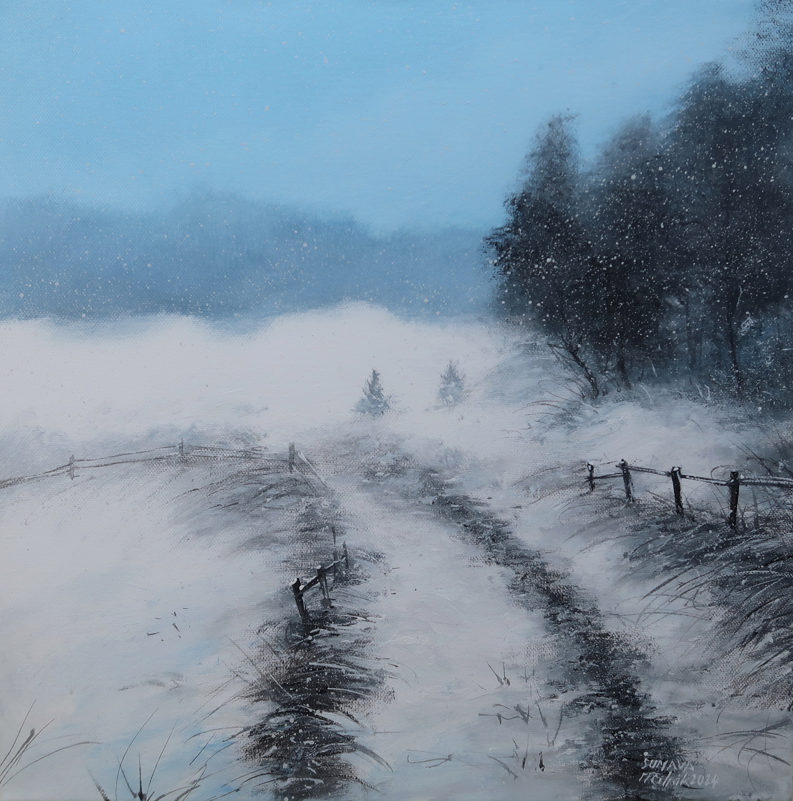 Šumava - Zimní cestou - originální malba akrylem na napnutém plátně/blindrámu - závěrečný trvanlivý lak - rozměr 40x40 cm - volně - bez rámu - namalováno i po stranách plátna - možno ihned zavěsit...