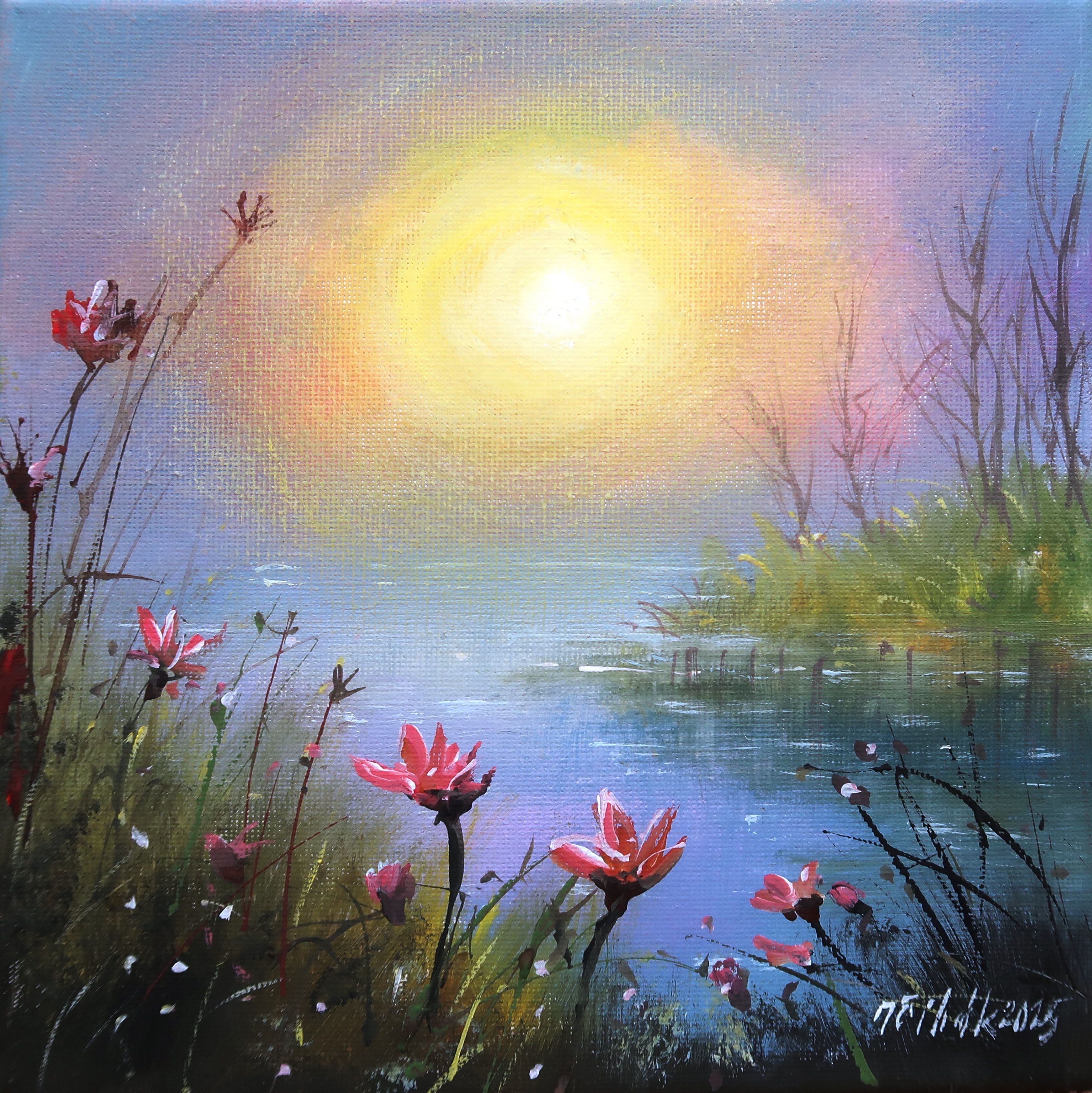 U jezírka - originální malba akrylem na napnutém plátně/blindrámu - závěrečný trvanlivý lak - rozměr 20x20 cm - volně - bez rámu - namalováno i po stranách plátna - možno ihned zavěsit...